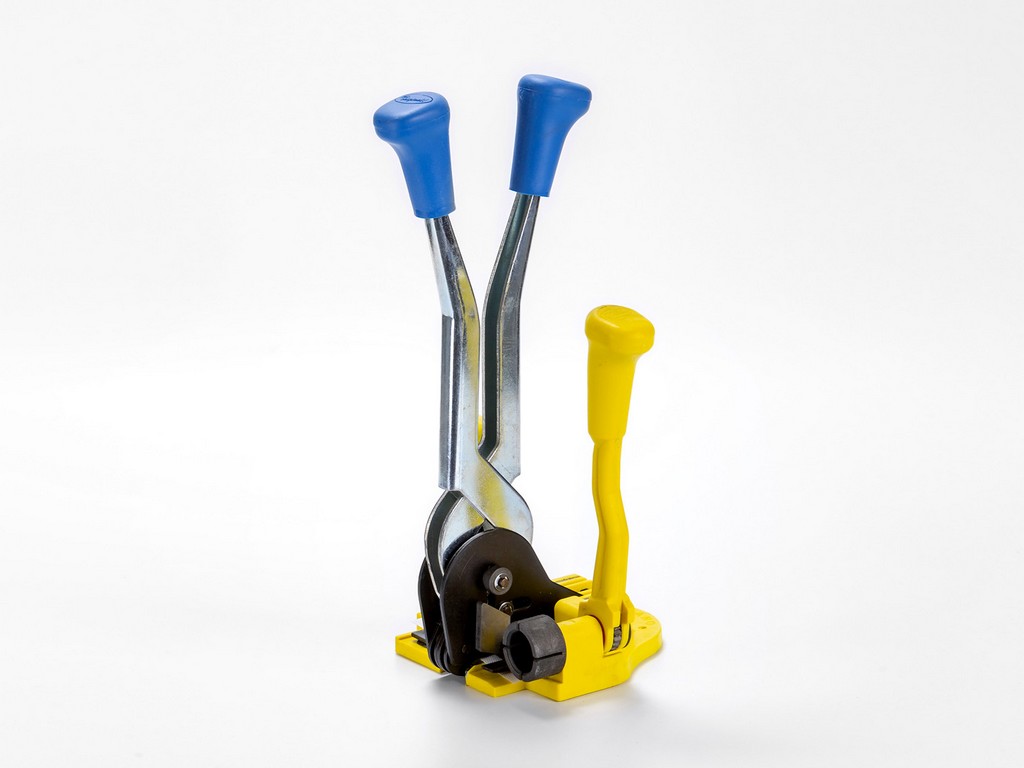 Ručný páskovač vďaka kombinácii napínača a klieští pre uzatvorenie kovovej